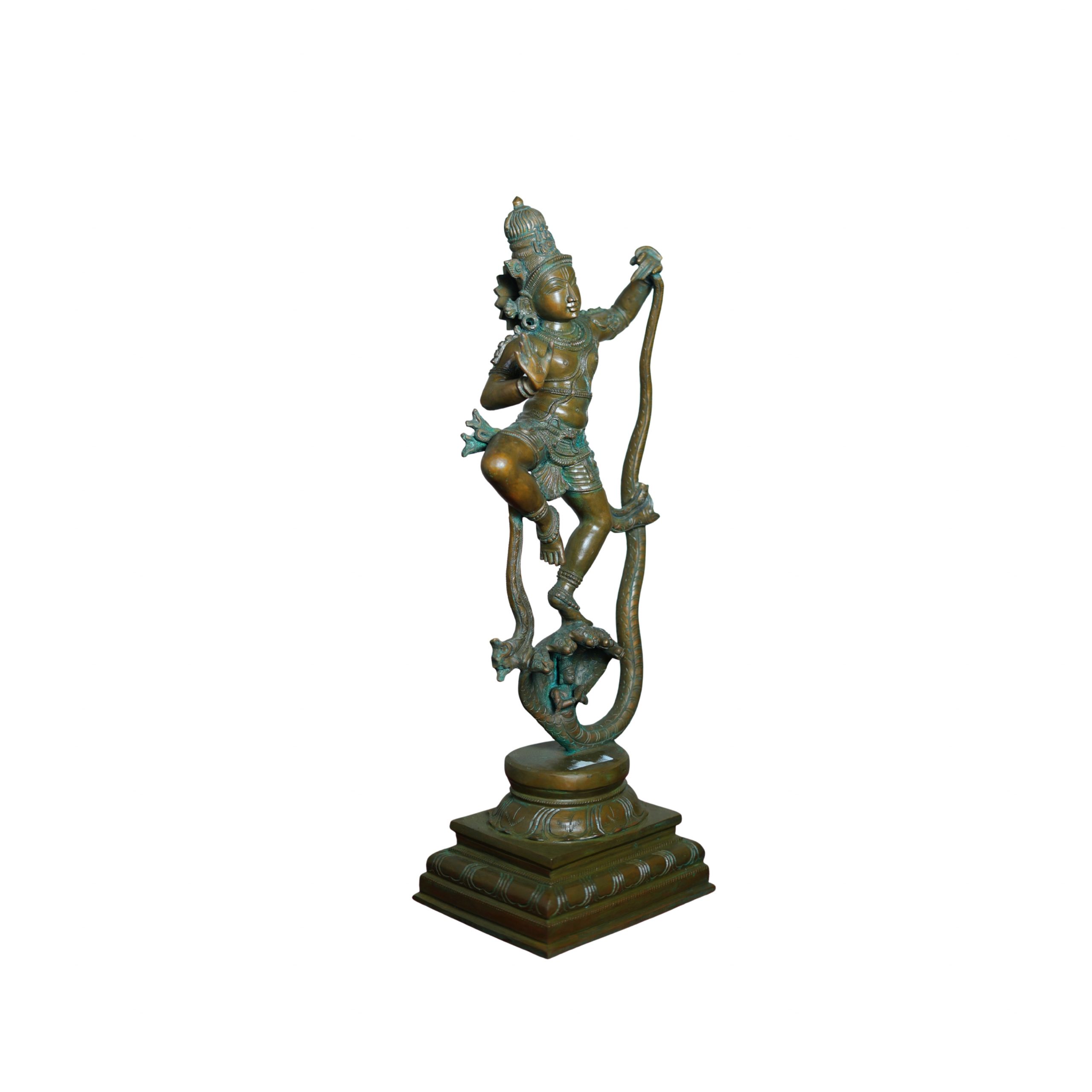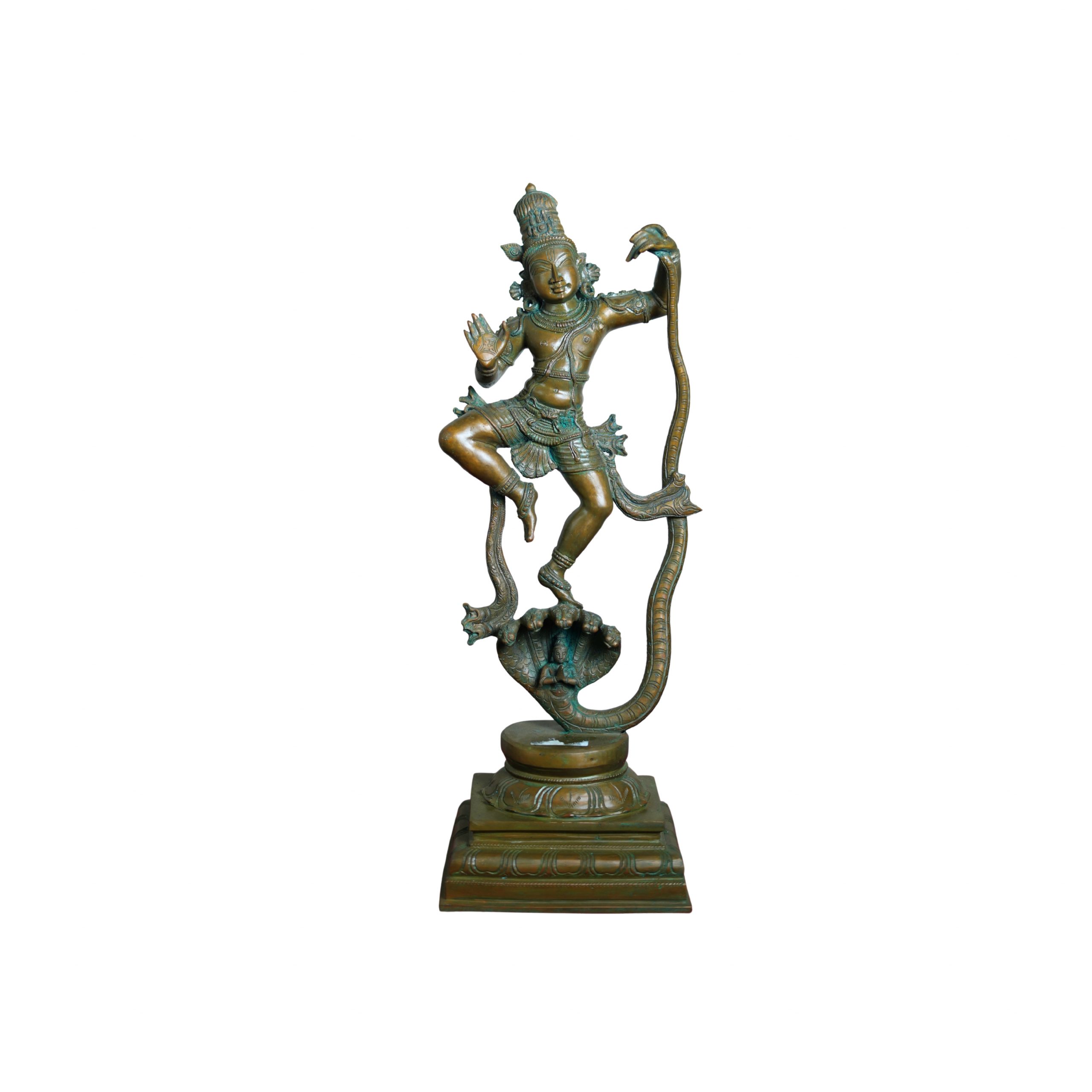 Handcrafted by the skilled artisans of Tamil Nadu using the age-old lost-wax (cire-perdue) technique, this sculpture reflects the finest traditions of South Indian bronze artistry. Every intricate detail—from Krishna’s serene expression and rhythmic posture to the fluid curves of the serpent—embodies devotion, movement, and artistic precision.