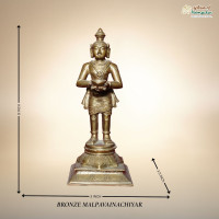 Crafted with exquisite detail and precision, this stunning bronze statue of Malpavainachiyar stands at 9 inches tall, making it a perfect addition to your home decor or collection. Malpavainachiyar, also known as Thayar, is a popular deity in Hinduism, revered for her beauty, grace, and compassion. This intricately designed statue captures her serene expression and elegant posture, bringing a sense of peace and tranquility to any space. The statue is made of high-quality bronze, ensuring durability and longevity. Its rich, warm tones and intricate textures add a touch of sophistication to any room, making it a timeless piece that will be cherished for years to come. Whether you are a devout worshipper seeking to enhance your spiritual practice or simply a lover of art looking for a unique and meaningful conversation piece, this exquisite statue of Malpavainachiyar is sure to captivate and inspire. Place it on your altar, mantel, or bookshelf to create a sacred focal point in your home. Or display it proudly in your living room, office, or meditation space to infuse your surroundings with positive energy and a sense of serenity. Elevate your decor with this beautiful bronze statue of Malpavainachiyar, a symbol of devotion, beauty, and grace. Bring a touch of tradition and spirituality into your home with this timeless piece that will be treasured for generations to come.