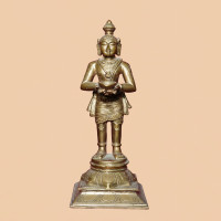 Crafted with exquisite detail and precision, this stunning bronze statue of Malpavainachiyar stands at 9 inches tall, making it a perfect addition to your home decor or collection. Malpavainachiyar, also known as Thayar, is a popular deity in Hinduism, revered for her beauty, grace, and compassion. This intricately designed statue captures her serene expression and elegant posture, bringing a sense of peace and tranquility to any space. The statue is made of high-quality bronze, ensuring durability and longevity. Its rich, warm tones and intricate textures add a touch of sophistication to any room, making it a timeless piece that will be cherished for years to come. Whether you are a devout worshipper seeking to enhance your spiritual practice or simply a lover of art looking for a unique and meaningful conversation piece, this exquisite statue of Malpavainachiyar is sure to captivate and inspire. Place it on your altar, mantel, or bookshelf to create a sacred focal point in your home. Or display it proudly in your living room, office, or meditation space to infuse your surroundings with positive energy and a sense of serenity. Elevate your decor with this beautiful bronze statue of Malpavainachiyar, a symbol of devotion, beauty, and grace. Bring a touch of tradition and spirituality into your home with this timeless piece that will be treasured for generations to come.
