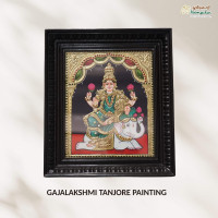 This beautiful Tanjore painting features Goddess Gajalakshmi, a sacred form of Goddess Lakshmi symbolizing wealth, prosperity, abundance, and royal power. The goddess is depicted seated on a lotus while two elephants shower her with water, representing purity, strength, and prosperity.