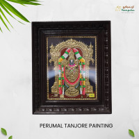 Bring home divine grace and timeless heritage with the Perumal Thanjavur Painting from Poompuhar. This exquisite artwork portrays Lord Perumal (Lord Vishnu), the preserver of the universe, symbolizing protection, prosperity, and spiritual harmony.