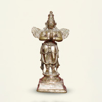This exquisite Bronze 3-inch standing Garudan is a stunning addition to any home decor collection. Crafted with intricate detailing by skilled artisans, this statue captures the majestic essence of the mythical Garudan bird. Made from high-quality bronze, this Garudan statue exudes a sense of timeless elegance and beauty. The hand-painted finish adds a touch of authenticity, making it a unique and eye-catching piece that will surely draw admiration from your guests. Standing at 3 inches tall, this Garudan statue is the perfect size for displaying on a mantelpiece, shelf, or desk. Its compact yet striking design makes it a versatile decor piece that can easily fit into any space. The Garudan, a symbol of power and protection in Hindu mythology, is said to ward off negative energies and bring positive vibes into your home. By adding this statue to your living space, you're not only enhancing your decor but also inviting good fortune and prosperity into your life. Whether you're a collector of religious artifacts or simply appreciate the beauty of intricate sculptures, this Bronze 3-inch standing Garudan is a must-have item for your home. Give your space a touch of elegance and mystique with this captivating statue.